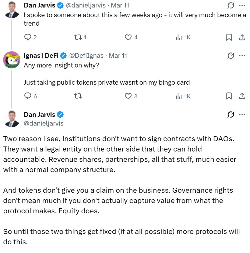 “The original idea behind governance tokens was coordination, not ownership… If they just become equity substitutes, then the experiment has basically collapsed back into the corporate model it was supposed to challenge,” he said.