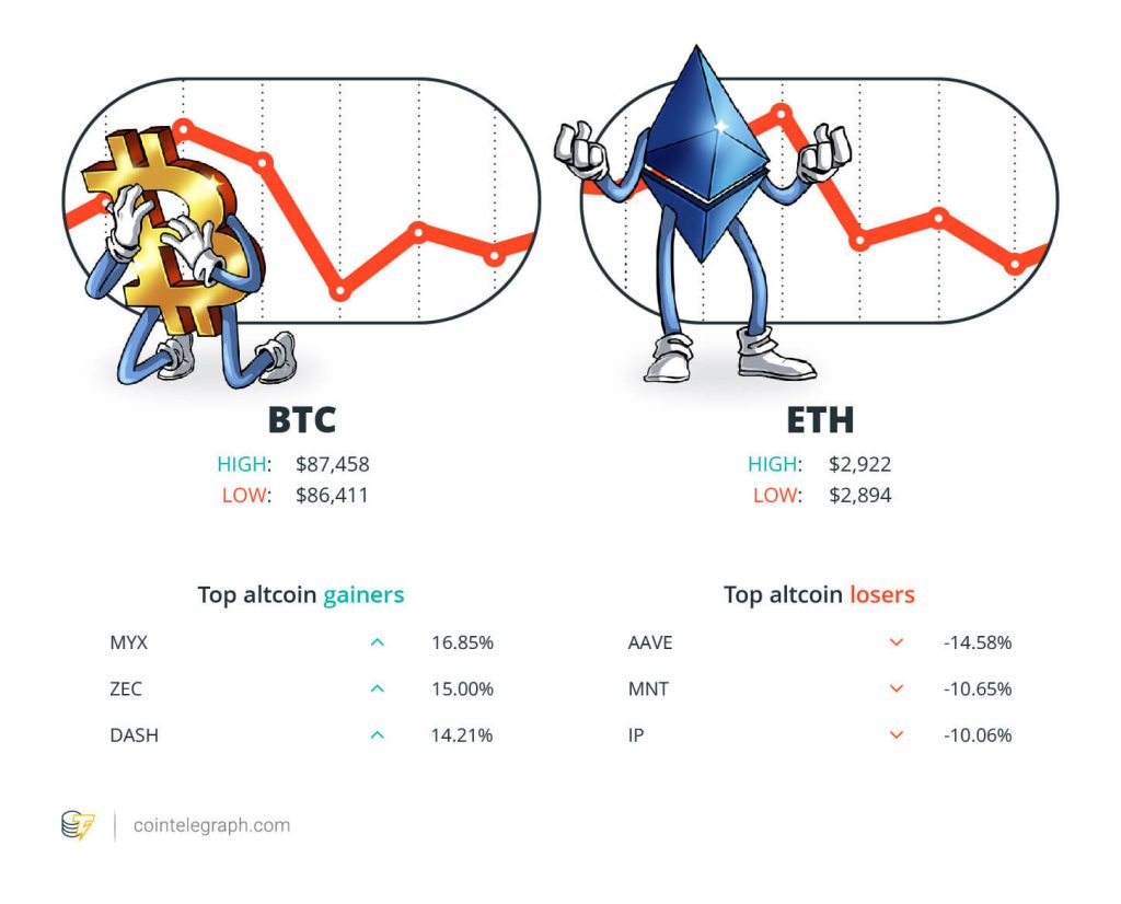 At the end of the week, Bitcoin (BTC) is at $87,458, Ether (ETH) at $2,922 and XRP at $1.84. The total market cap is at $2.96 trillion, according to CoinMarketCap.