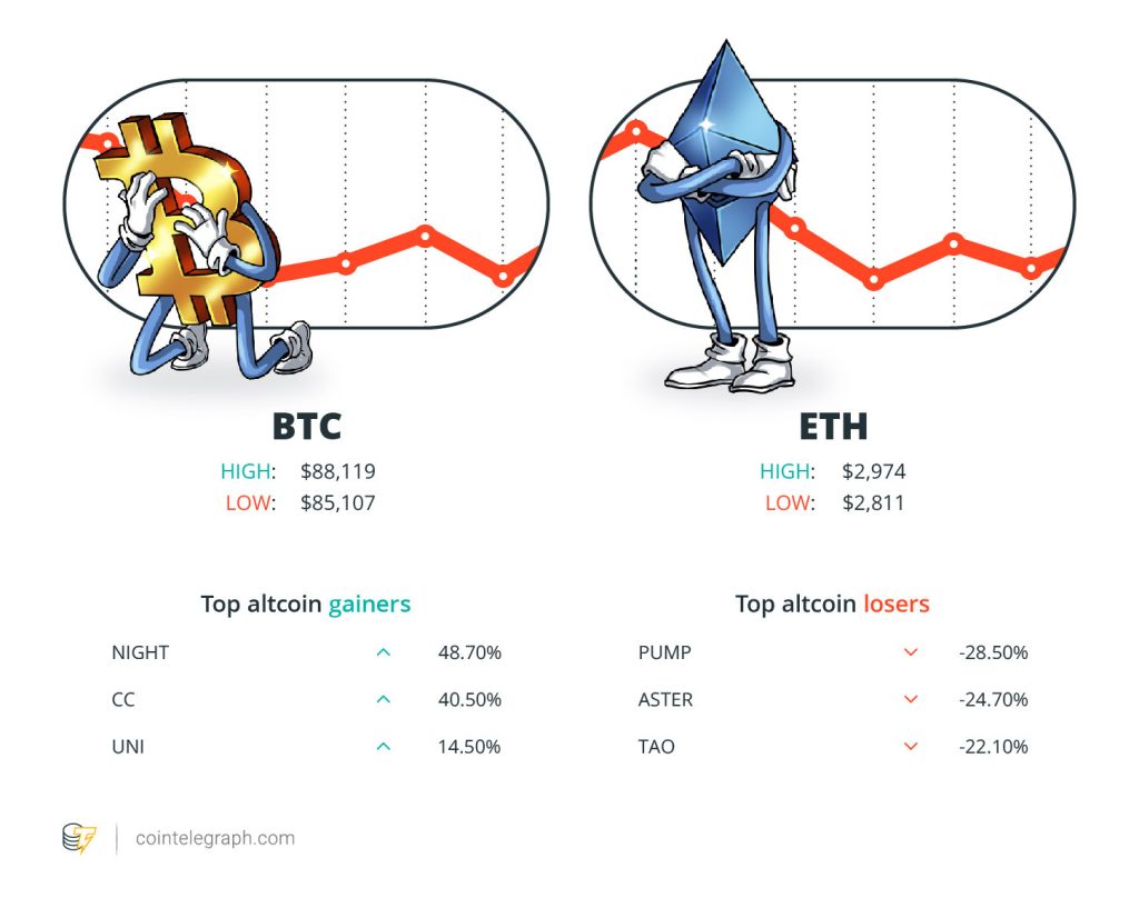 The top three altcoin losers of the week are Pump.fun (PUMP) at 28.50%, Aster (ASTER) at 24.70% and Bittensor (TAO) at 22.10%. For more info on crypto prices, make sure to read Cointelegraph’s market analysis.