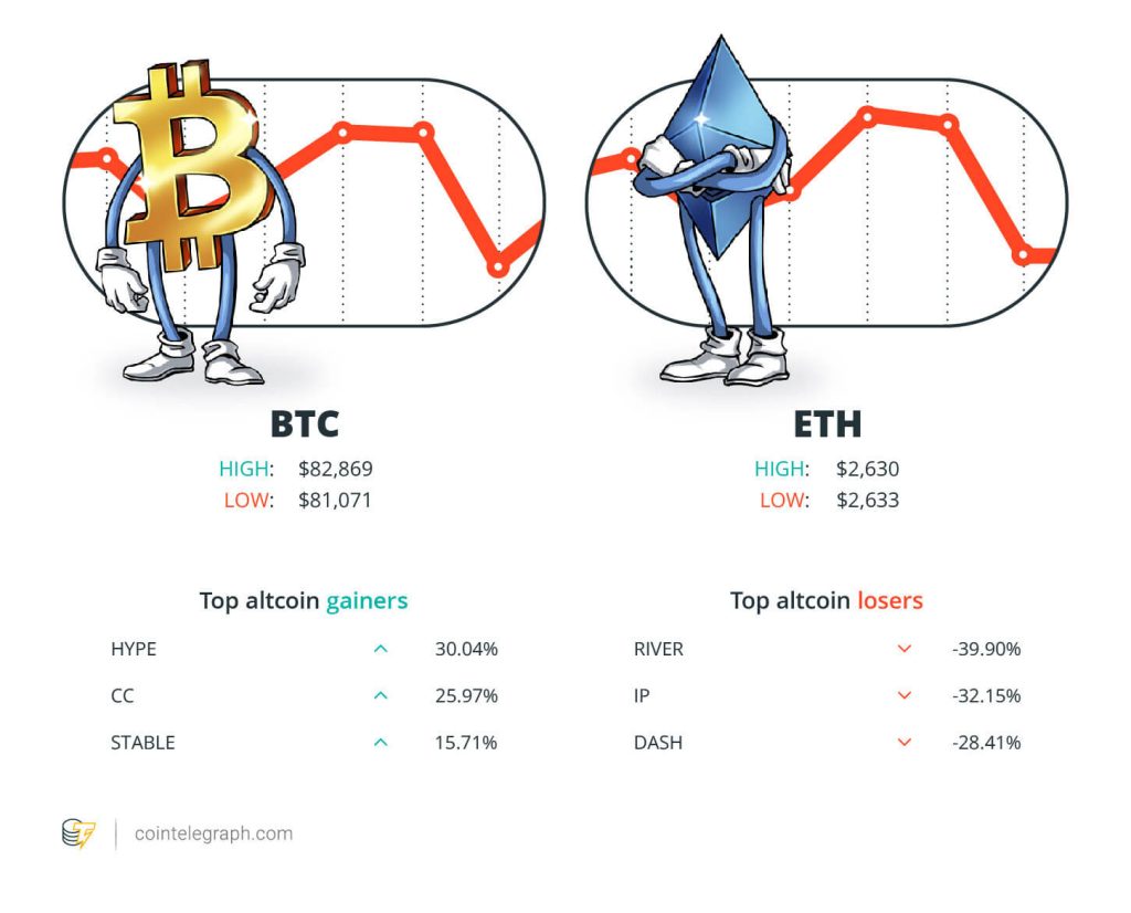 The top three altcoin losers of the week are River (RIVER) at 39.90%, Story (IP) at 32.15%, and Dash (DASH) at 28.41%. For more info on crypto prices, make sure to read Cointelegraph’s market analysis.