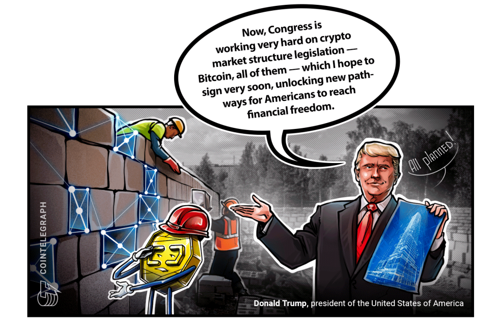 “Now, Congress is working very hard on crypto market structure legislation — Bitcoin, all of them — which I hope to sign very soon, unlocking new pathways for Americans to reach financial freedom.”