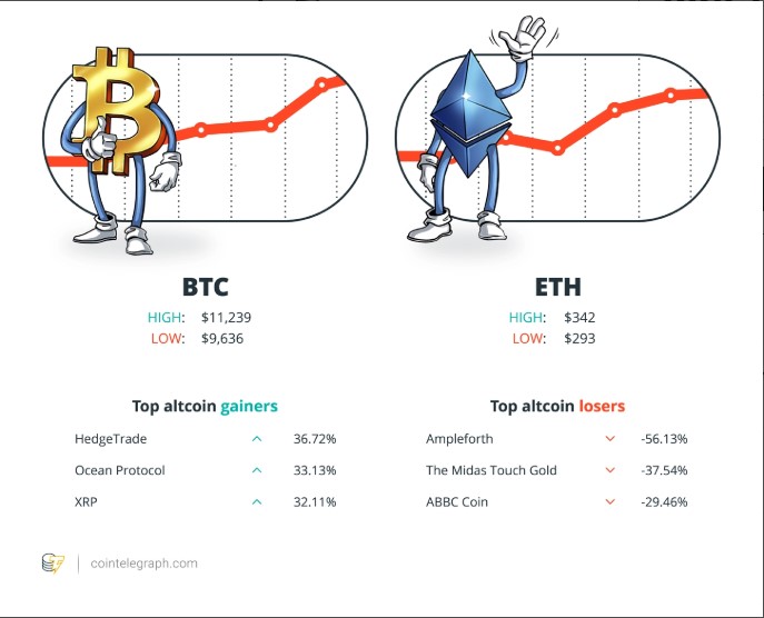 Among the biggest 100 cryptocurrencies, the top three altcoin gainers of the week are HedgeTrade, Ocean Protocol and XRP. The top three altcoin losers of the week are Ampleforth, The Midas Touch Gold and ABBC Coin.