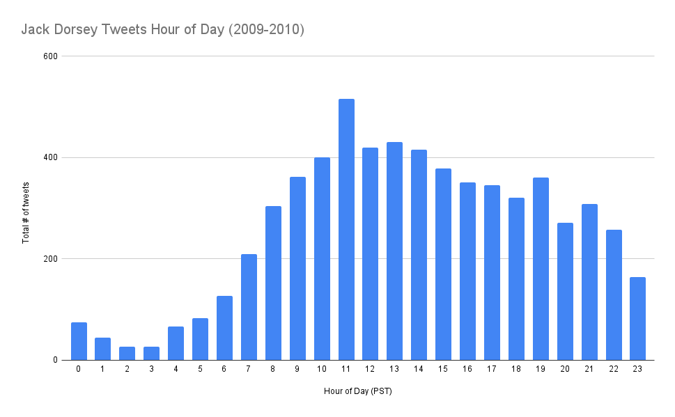 In contrast, Dorsey’s tweets were far more erratic — consistent with someone who is constantly travelling between different time zones. However, it is worth noting that Dorsey was based in San Francisco around the time Bitcoin was created.
