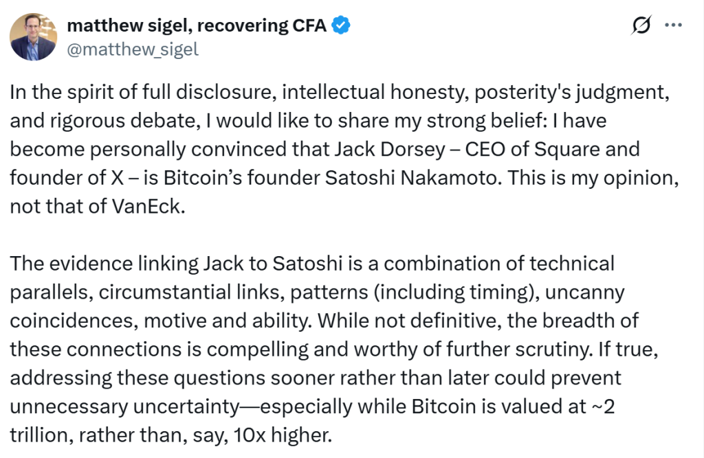 So what makes some intelligent and respected people — including VanEck’s head of digital assets research Matthew Sigel — so confident that Dorsey is the creator of Bitcoin?