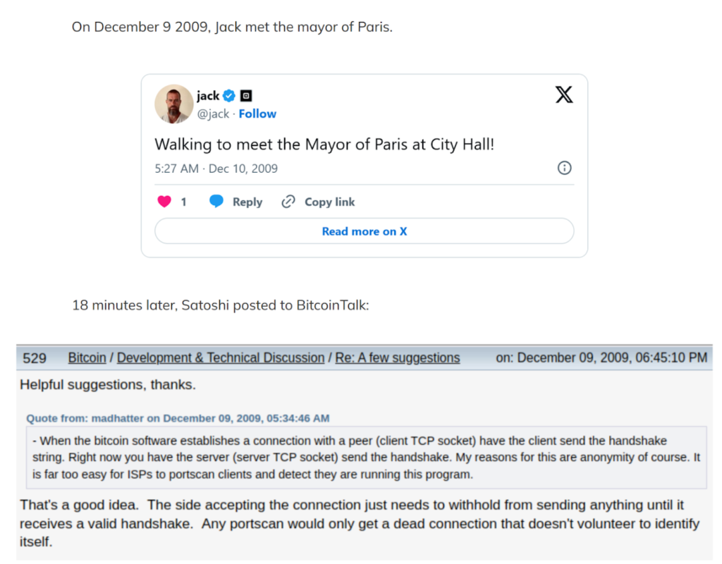 In another instance, Jack said he was walking to meet the mayor of Paris at City Hall on Dec. 9, 2009, and only 18 minutes later, Satoshi posted several responses to a technical suggestion thread about Bitcoin.