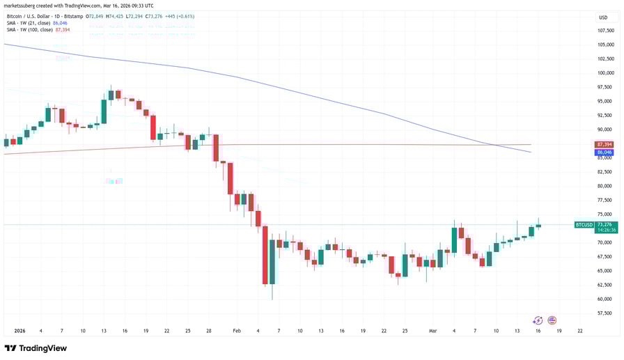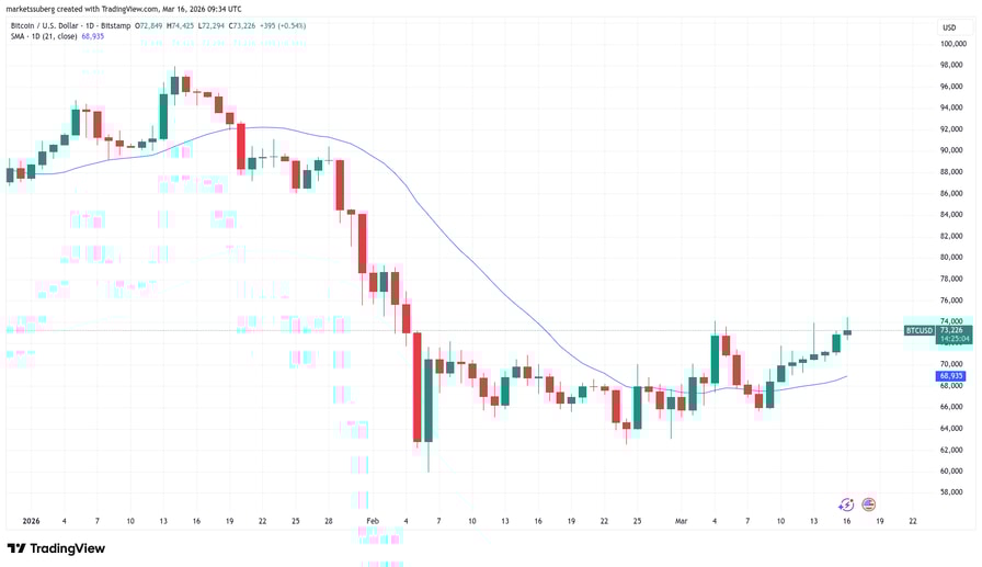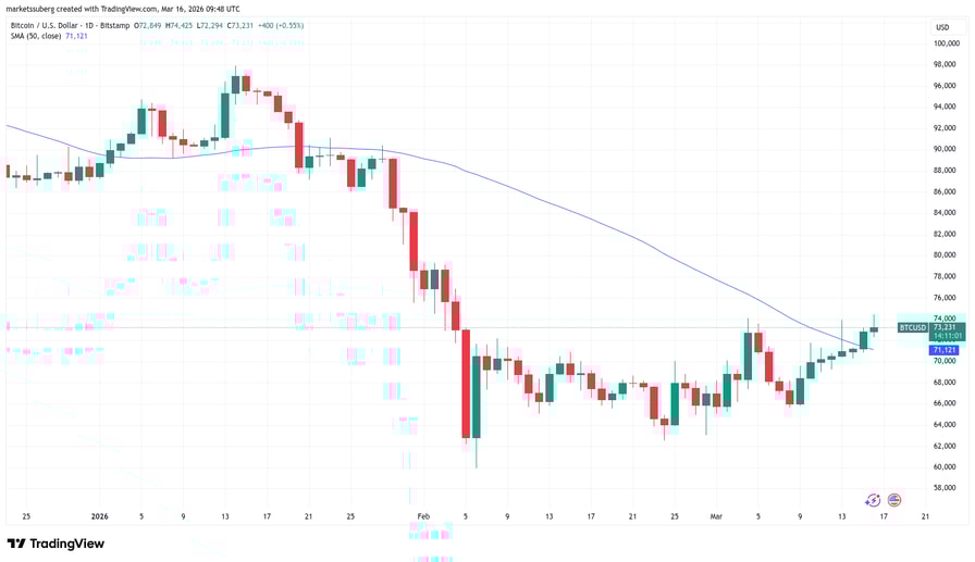 Bitcoin bulls stepped in toward the weekly close to deliver a push to $74,425 — a level that marked new six-week highs.