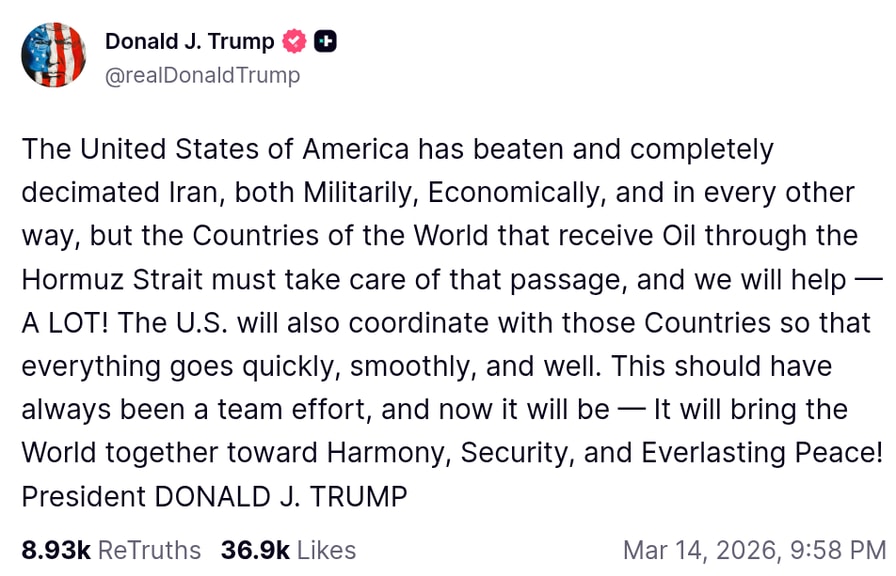 In a post on Truth Social, Trump wrote that “the Countries of the World that receive Oil through the Hormuz Strait must take care of that passage, and we will help — A LOT!”