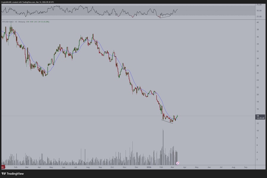 At the weekend, crypto trader Michaël van de Poppe again flagged an emerging bullish divergence in relative strength index (RSI) readings for BTC/XAU.