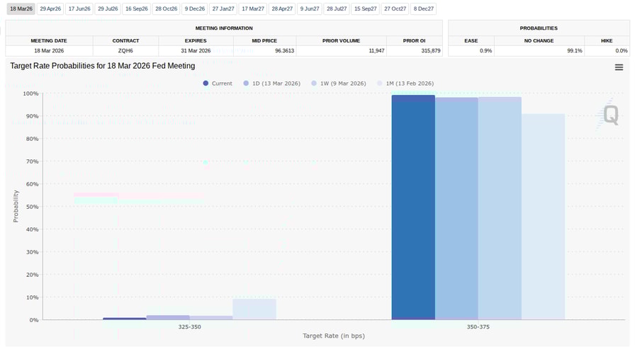 Fed target rate probabilities for March 18 FOMC meeting (screenshot). Source: CME Group FedWatch Tool