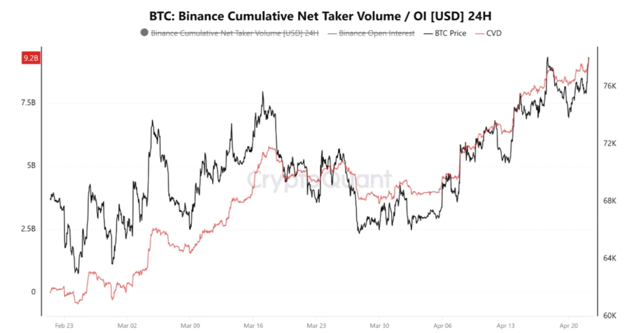 Cumulative net taker volume, a metric that measures the running total of the difference between aggressive buyer and seller volume in Bitcoin futures, has risen to $9.2 billion on Binance, its highest level since February.