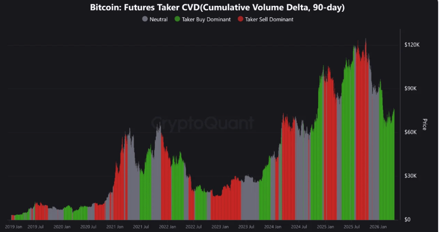 The 90-day Futures Taker cumulative volume delta (CVD), a metric that measures the difference between buy and sell volume over three months, further reinforces this picture.