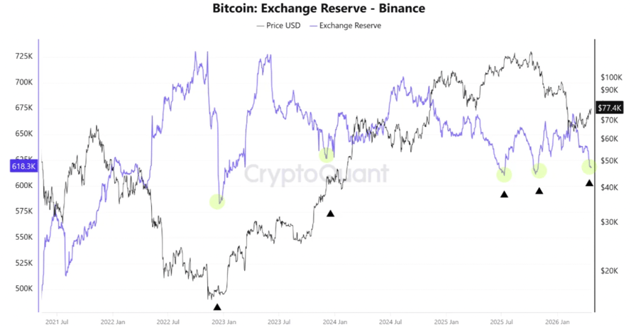 CryptoQuant’s exchange reserve data highlighted signs of supply tightening, as BTC balance on Binance “continues to decrease significantly.”