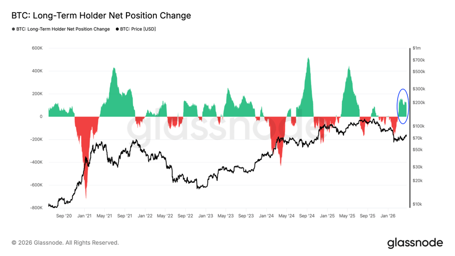 Additional data also reflects an accumulation phase, as long-term holders (LTHs), investors who have held Bitcoin for more than 155 days, ramped up buying.