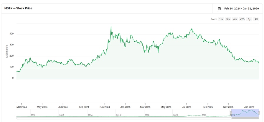 The company currently holds in excess of 700,000 BTC, with its stock price at $143, having tumbled nearly 70% from its local highs of $455 in July last year.