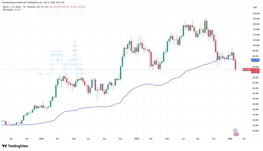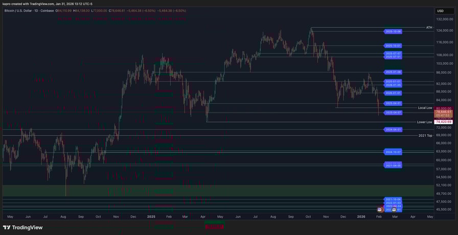 At the time of writing, BTC/USD traded below $78,000, with the April 2025 bottom near $74,500 now in focus.