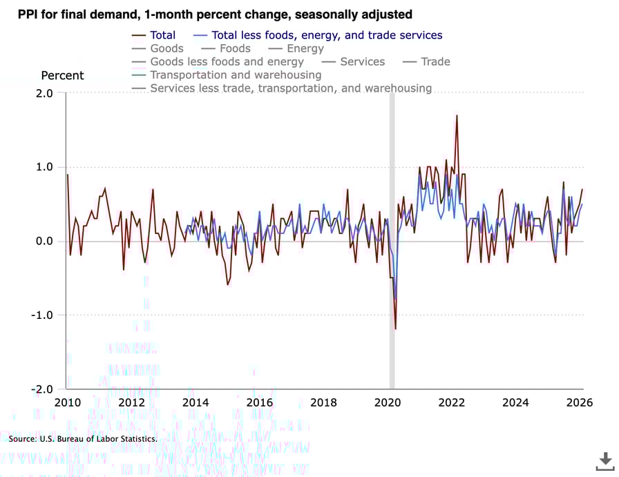 - US PPI inflation surpasses market expectations again, continuing its “hot” 2026 trend.
