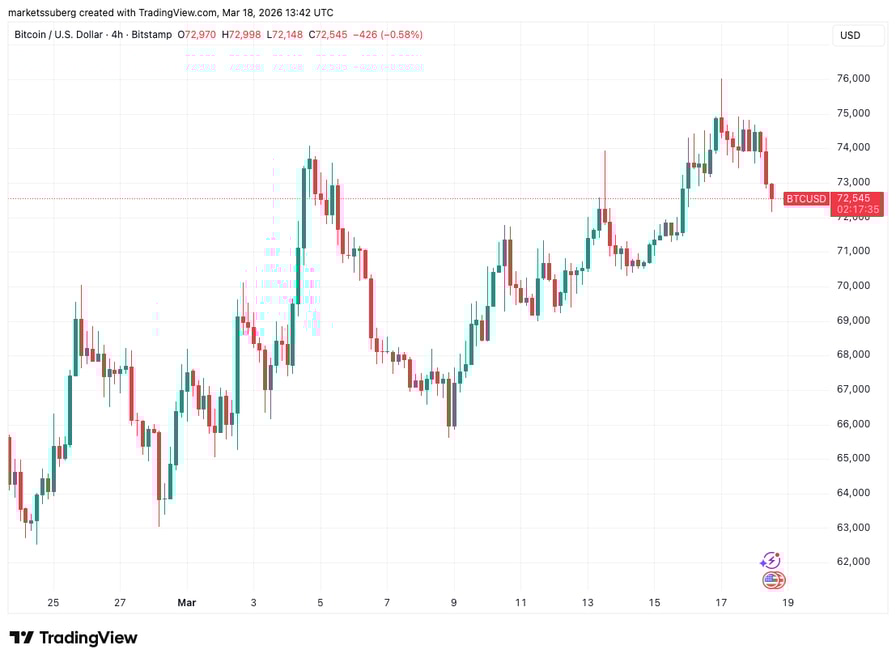 Data from TradingView showed $72,000 coming back into focus for BTC price action after the February print of the Producer Price Index (PPI).