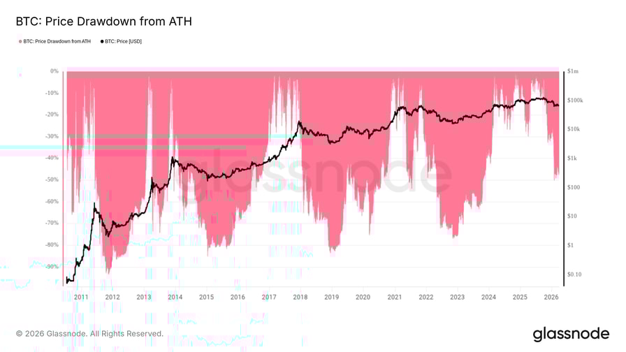 BTC price drawdowns from all-time highs. Source: Glassnode