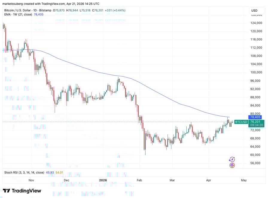 - Bitcoin bulls still need to clear the nearby 21-week trend line keeping price pinned since October 2025.