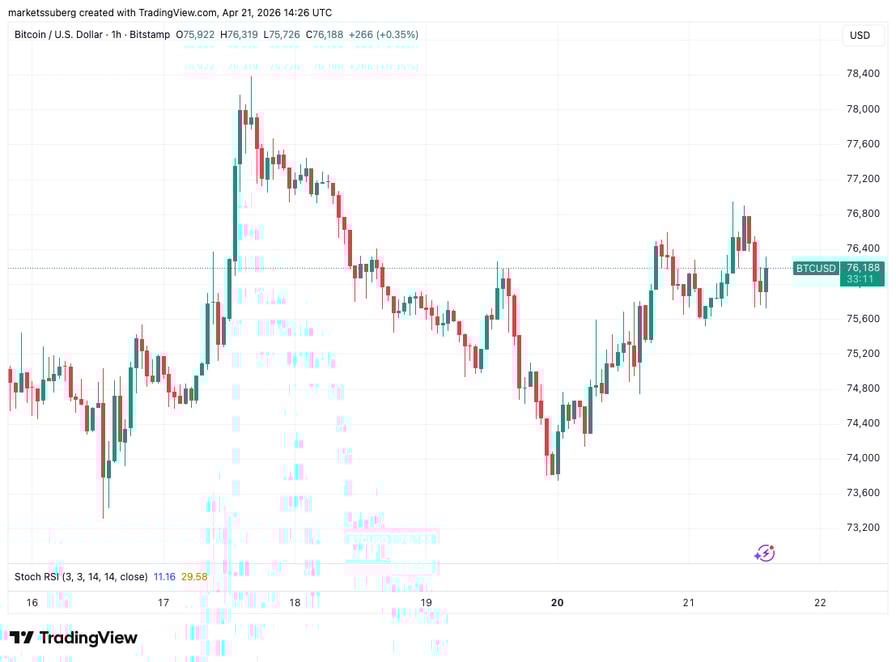 Data from TradingView showed BTC/USD approaching $77,000 for the first time this weekly candle.