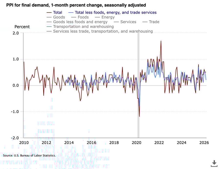 - US PPI inflation remains below market expectations despite the war in Iran having no end in sight.