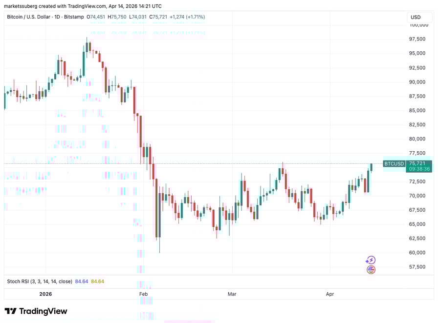 - Bitcoin upside continues as bulls target $76,000 — the highest price since early February.