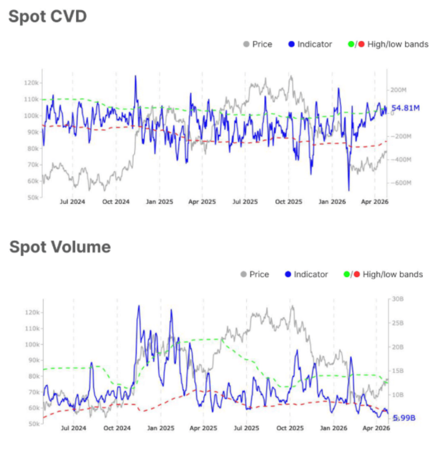 Bitcoin spot CVD and spot volume charts. Source: Glassnode