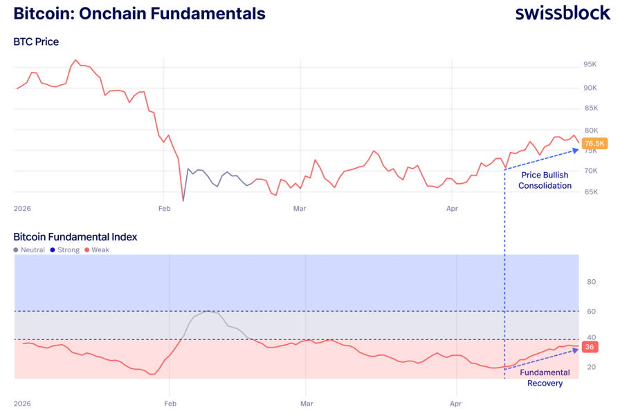 Swissblock’s Bitcoin Fundamental index, which measures network health, growth, demand, activity, and capital flows, echoes this outlook.