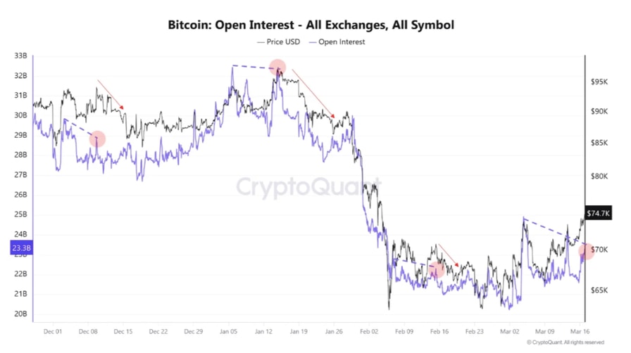 - Bitcoin faces flat Coinbase spot demand and an open interest divergence as prices rise above $75,000.