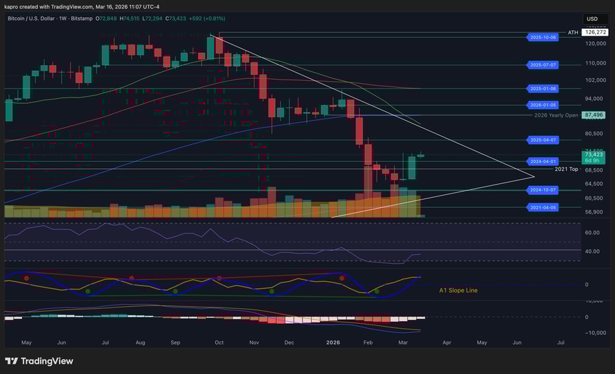 “Bulls are currently attempting to flip resistance at the Q2 2024 Timescape Level, and now psychological resistance at $75k is coming into focus. If bulls can push higher the next targets are at the Q2 2025 Timescape Levels at $78.3k and $82.5k,” he explained.