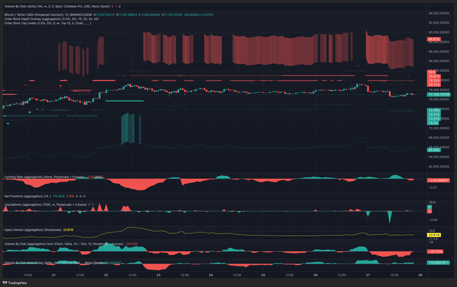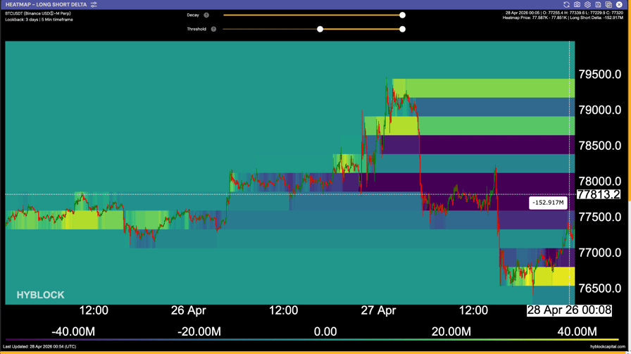 Bitcoin pulled back to retest $76,500 as support, but the long-to-short delta indicates bulls have a significant advantage if the range highs are reclaimed.