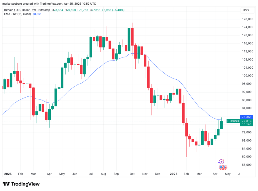 The moving average, which BTC/USD has traded below since October 2025, sat at $78,400 on the day.