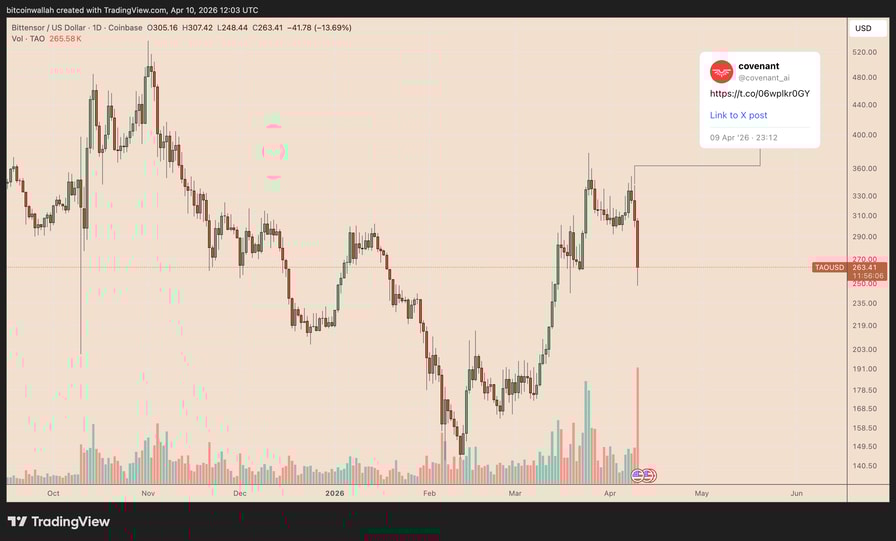 TAO’s price dropped by roughly 30% from its weekly high to around $249. A huge part of that downside came after Covenant AI accused Bittensor of running a “decentralized theater.”