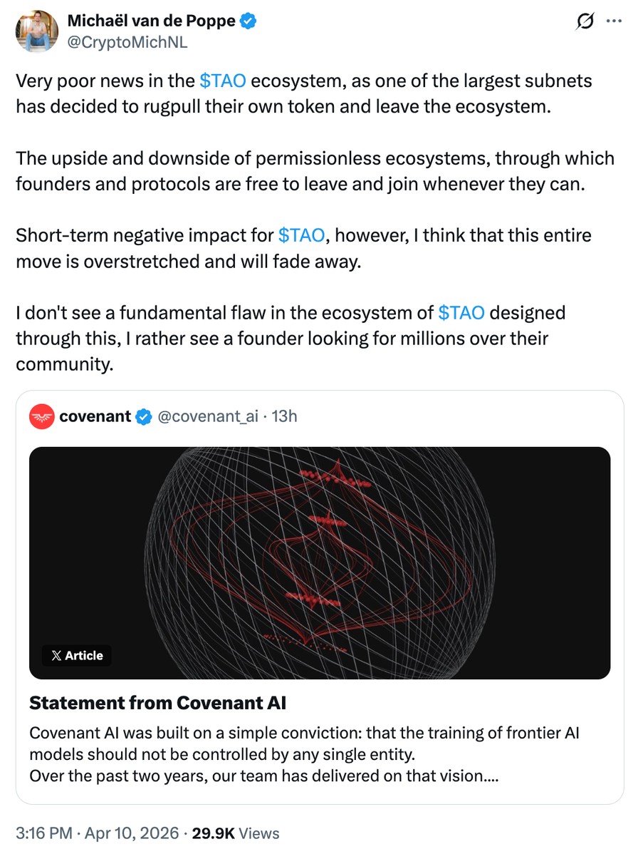 - Covenant AI accused Bittensor of being centralized, leading to a 30% drop in TAO prices.