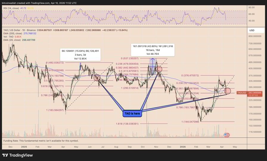 TAO is currently consolidating inside the 0.382–0.5 Fibonacci retracement range, a zone that has historically acted as a short-term consolidation area during TAO’s broader macro-top corrections.