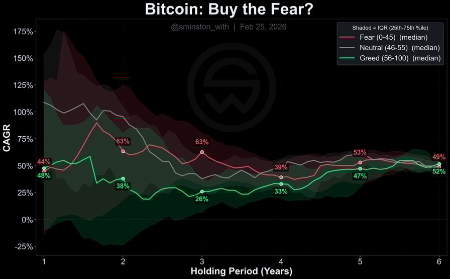 With said that an analysis of the past Bitcoin market cycles shows that buying BTC during fear phases delivered stronger returns over a two to four-year window.