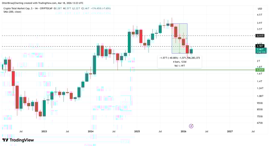 The move coincides with a recovery in the total crypto market capitalization, which has added 7.65% in March, equivalent to roughly $174 billion. This marks the first monthly bullish expansion since September 2025. Before this, the market declined nearly 40%, dropping to $2.28 trillion from $3.65 trillion in the previous five months.