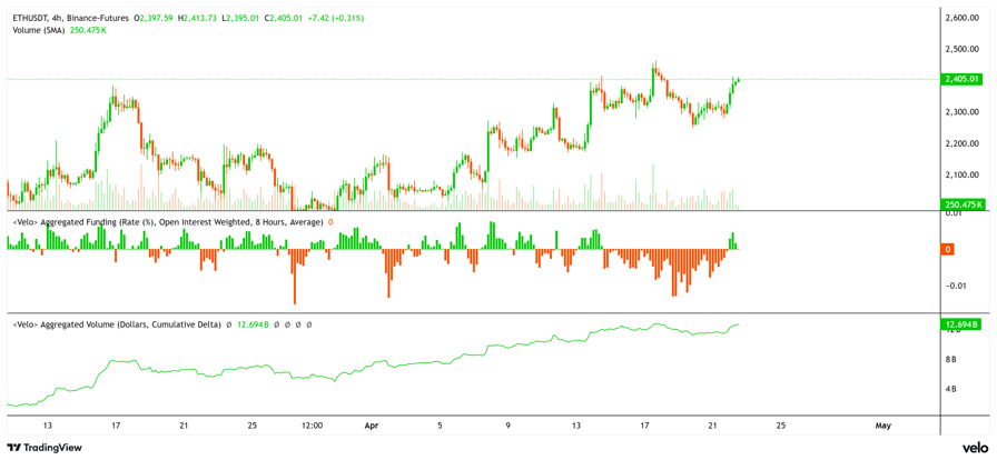Ether price, funding rate, and futures CVD. Source: velo.chart