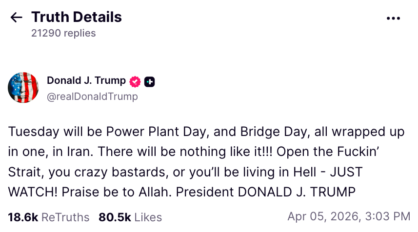 In a post on Truth Social at the weekend, Trump appeared particularly impatient, calling the day of the deadline “Power Plant Day” and "Bridge Day” while demanding that Hormuz reopen.