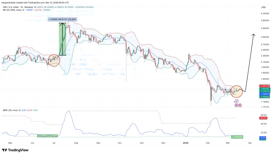 XRP analyst Arthur said, with the Bollinger Bands tightening, a close above $1.50 “would confirm momentum.”