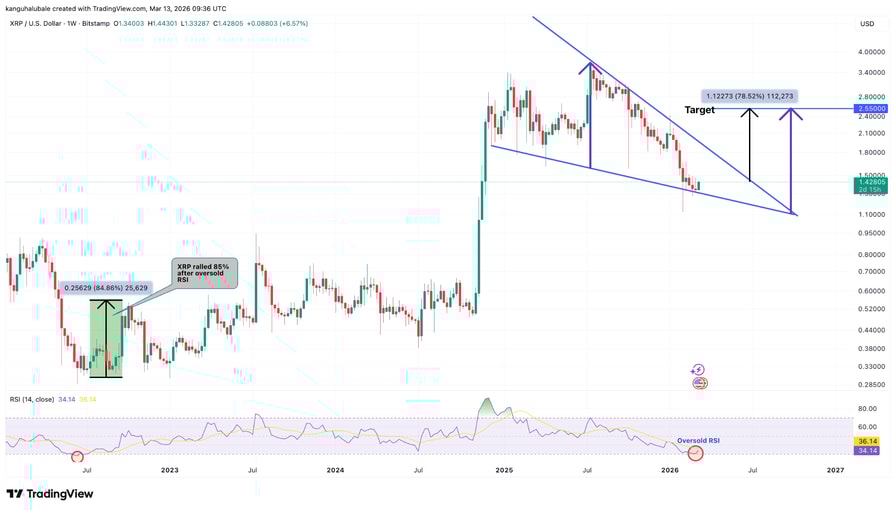 XRP price action is forming a falling wedge pattern on the weekly chart, a structure typically associated with bullish reversals after a prolonged downtrend.