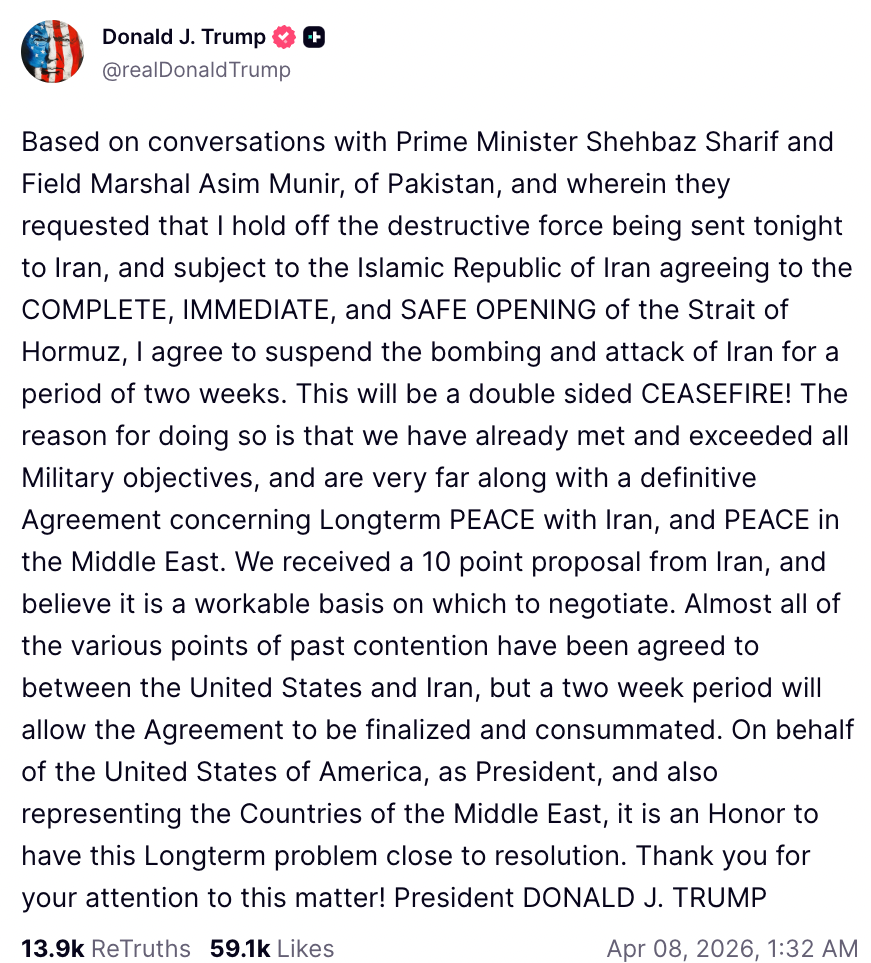 The price reacted to Trump’s confirmation of a two-week ceasefire agreement with Iran, conditional on “complete, immediate, and safe opening,” of the Strait of Hormuz.