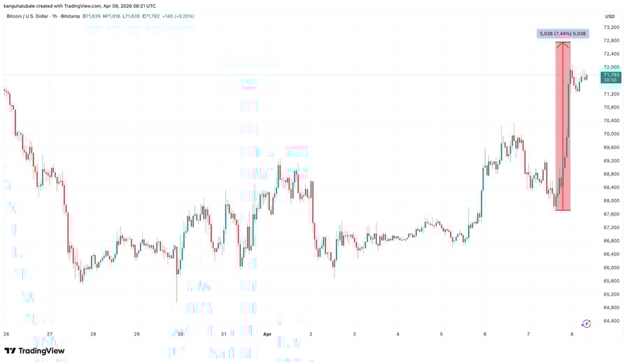 Bitcoin (BTC) surged to $72,700 during Tuesday’s New York trading session as oil fell below $100 per barrel after US President Donald Trump confirmed a two-week ceasefire with Iran.