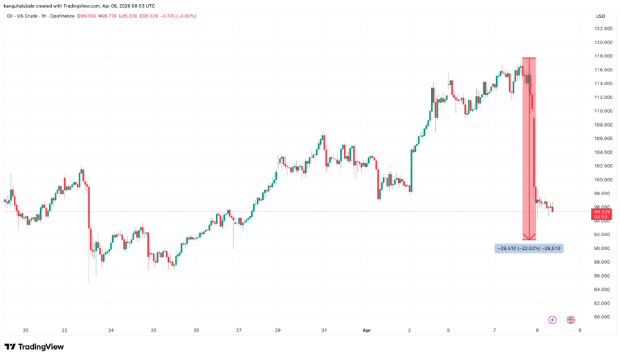 Oil, which had spiked to between $110 and $118 per barrel amid the conflict, fell as much as 16% to $92 from an intraday high of $110. WTI crude dropped to $90 before recovering to $95 at the time of writing.