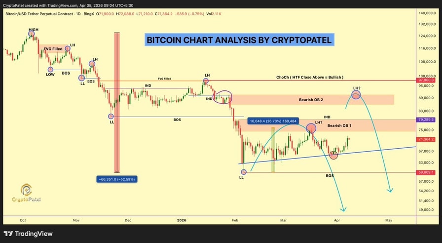 “Bitcoin reclaimed $72,000, but bears are waiting at this level,” fellow analyst Crypto Patel said, adding that Bitcoin will “decide the next move” once it breaks above $76,000.