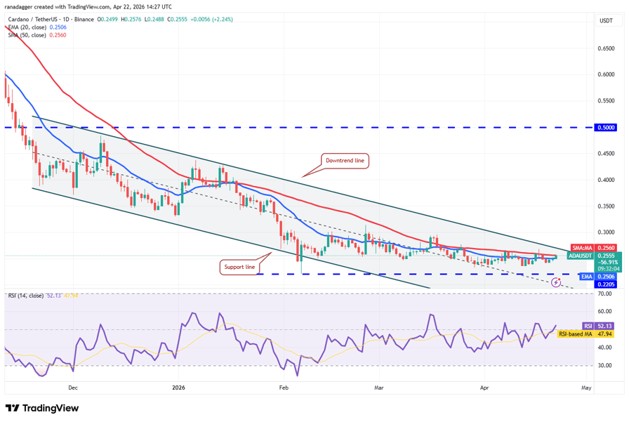 Cardano (ADA) has risen to the stiff resistance zone between the 50-day SMA ($0.26) and the downtrend line.