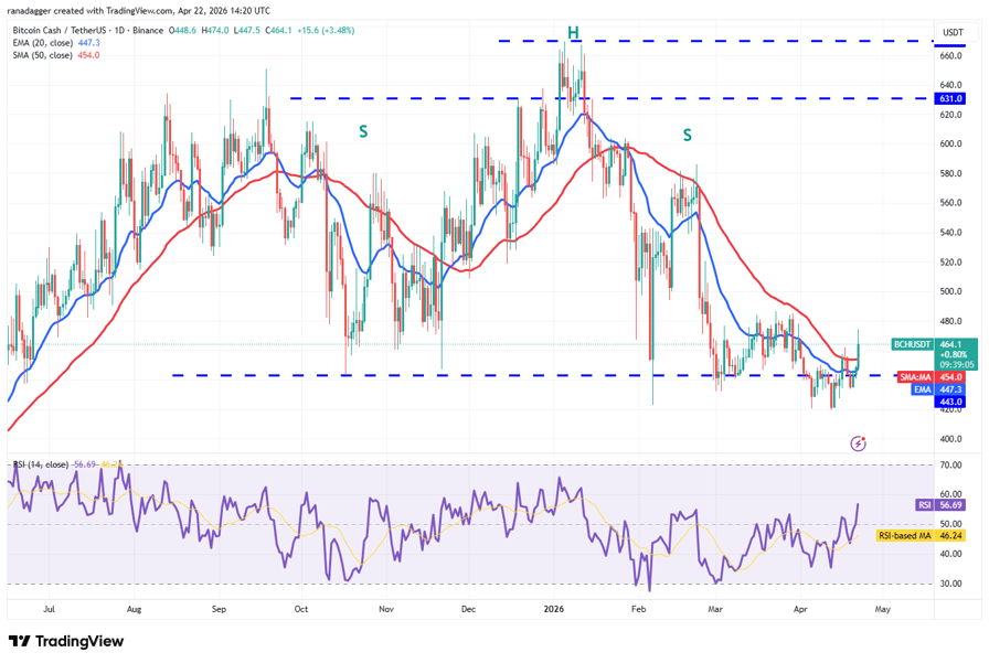 Bitcoin Cash (BCH) has broken above the 50-day SMA ($454), indicating solid demand at lower levels.