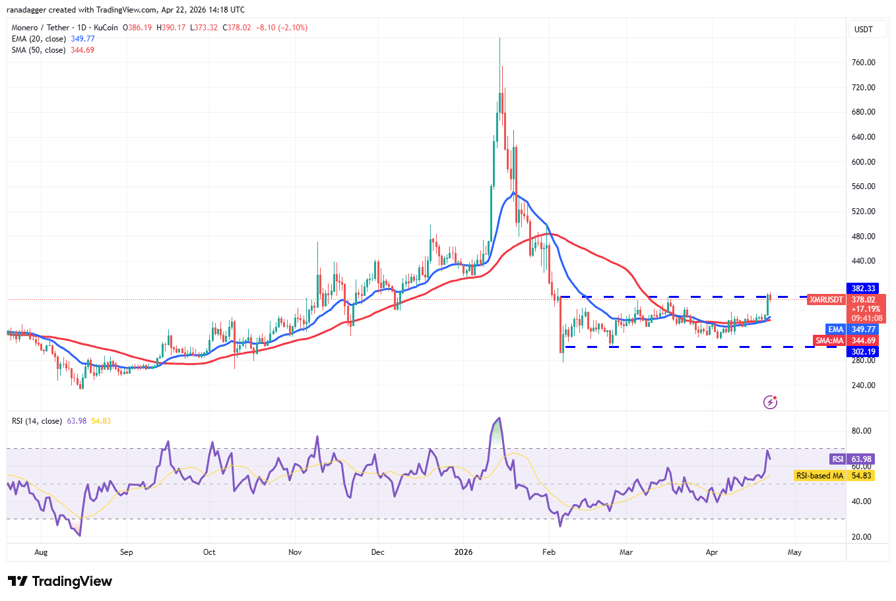 Monero (XMR) surged and closed above $382 on Tuesday, but bulls are struggling to sustain the gains.