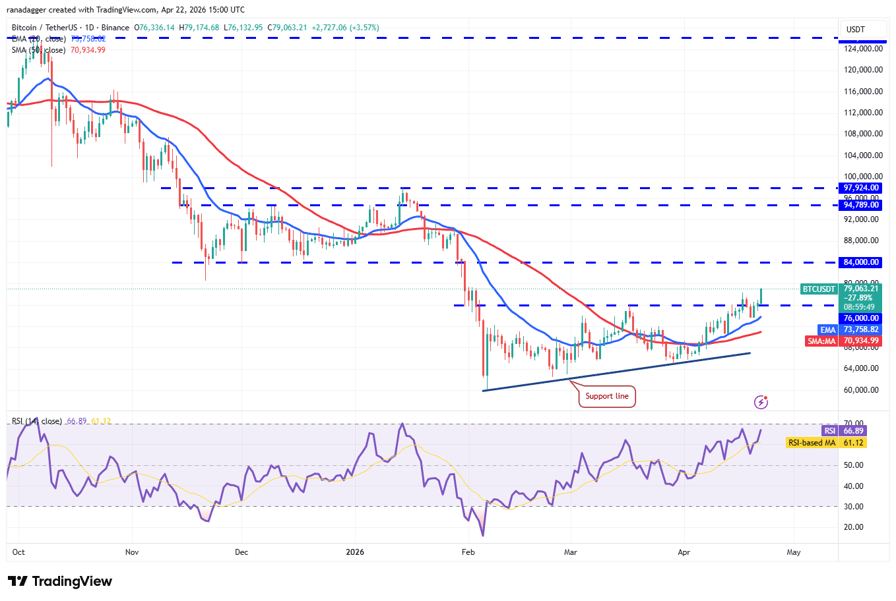 BTC turned up from the 20-day exponential moving average ($73,758) on Monday and rose above the $78,333 level on Wednesday, indicating an advantage to the bulls.