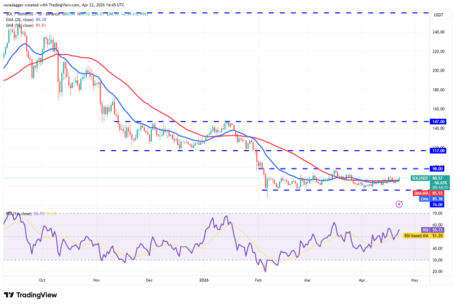 If the price rises above $91, the SOL/USDT pair may climb to the overhead resistance at $98. Sellers are expected to fiercely defend the $98 level, but if the bulls prevail, the uptrend may reach $117.